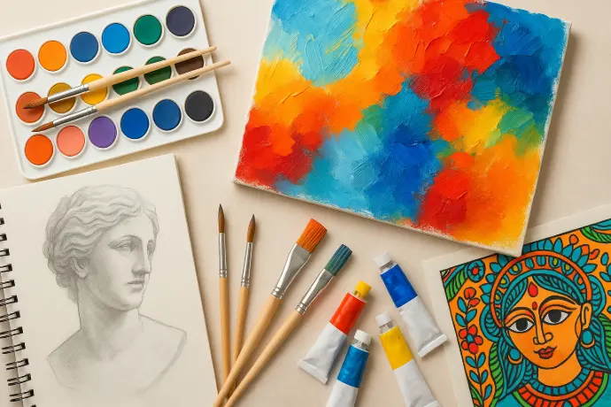 Our Drawing and Fine Arts Course covers sketching, watercolor, oil painting, pastel work, and Indian traditional arts. Learn professional techniques in a guided studio environment and develop your portfolio step-by-step — from basic strokes to advanced compositions. Perfect for beginners, hobbyists, and aspiring professionals.
